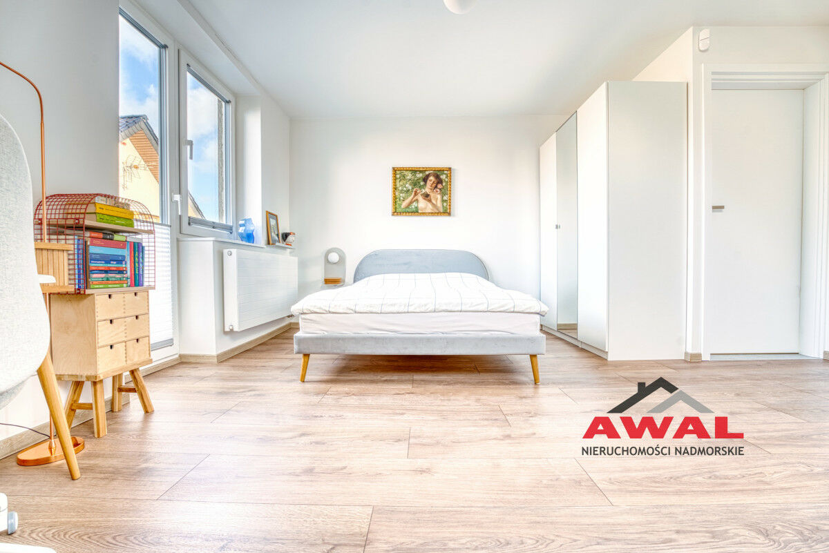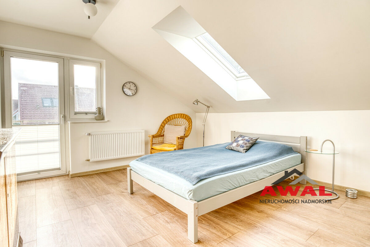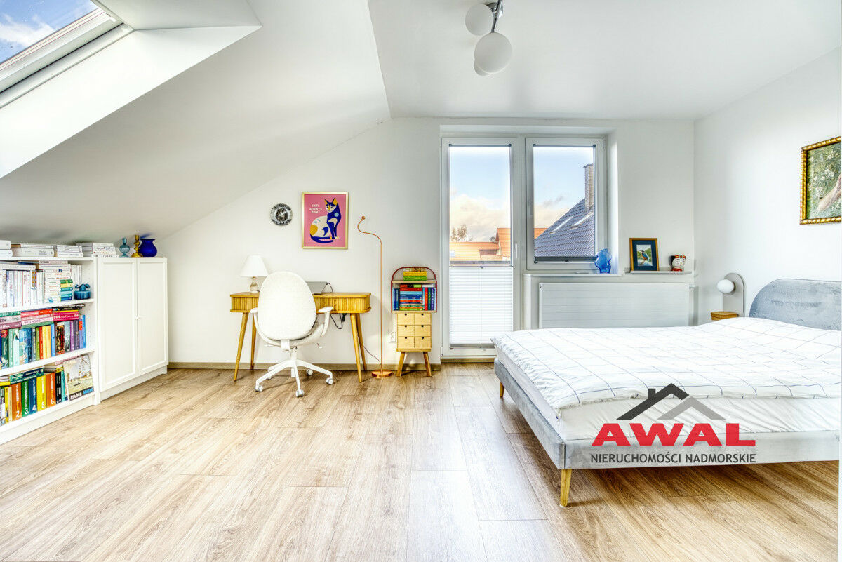 Piętro: sypialnia nr 1 o pow. 22,3 m2 (wyjście na balkon o ekspozycji północnej), sypialnia nr 2 o pow. 17,5 m2 (wyjście na balkon o ekspozycji południowej)+ łazienka o pow. 5 m2